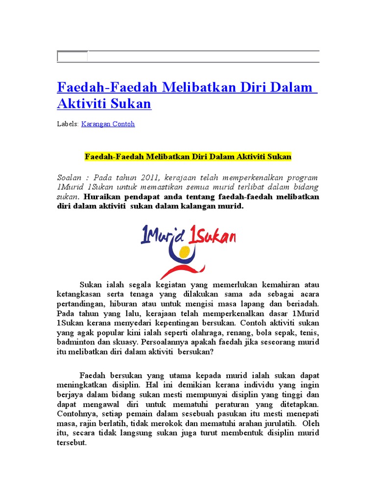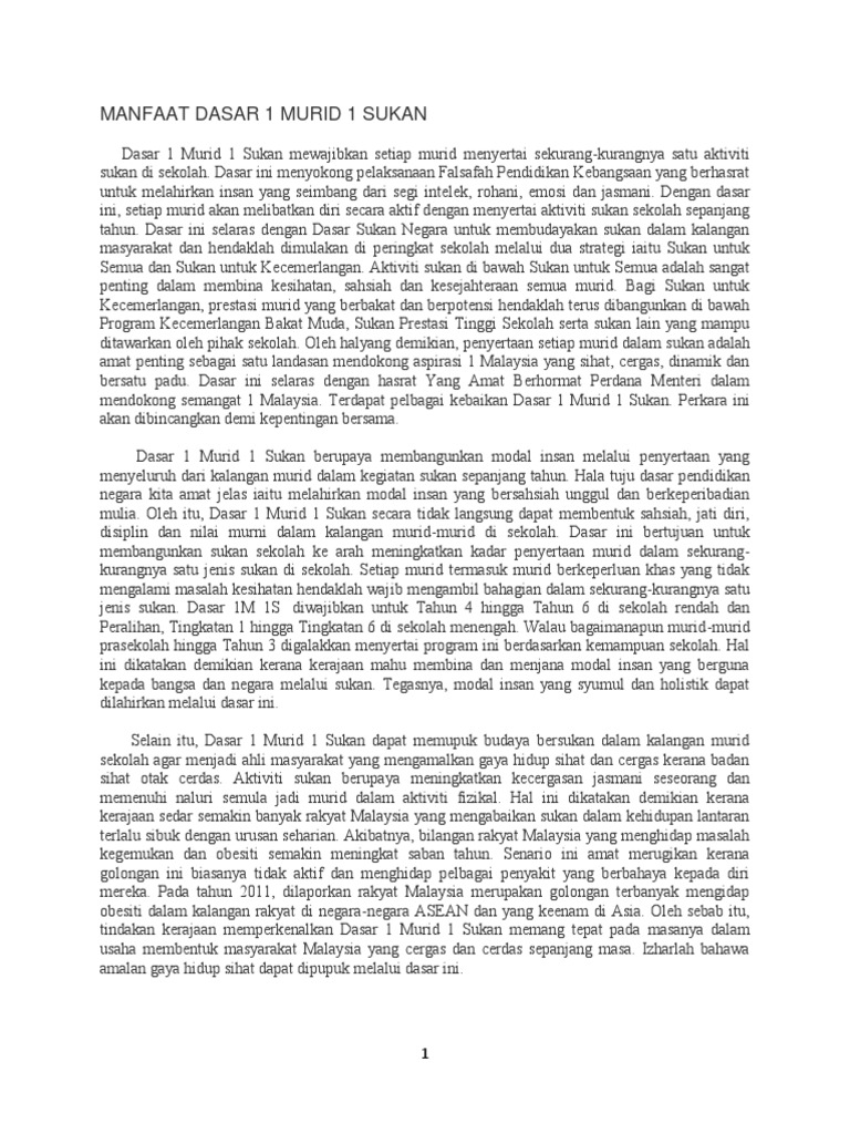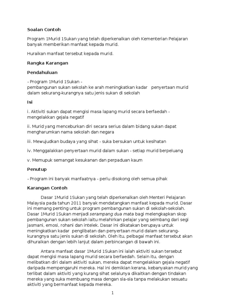 Karangan 1 Murid 1 Sukan : Semarakkan 1 murid 1 sukan.. Ada juga saya maklum yang pelajar terus ke aktiviti kelab sukan dan permainan selepas kelas tambahan tamat, tetapi baki hanya 1 jam. Ada sekolah yang mentiadakan aktiviti 1 murid 1 sukan. Karangan bahasa melayu spm/pt3 : Melahirkan bangsa sihat 1 malaysia. Dalam usaha menggalak dan mencungkil potensi murid dalam bidang sukan, kpm telah memperkenalkan dasar l murid l sukan.
