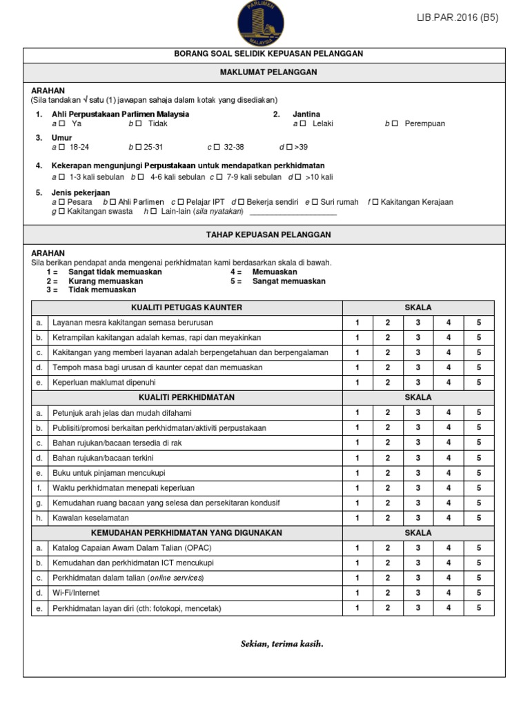 Soal Selidik Kepuasan Pelanggan from imgv2-1-f.scribdassets.com Hasil kajian mendapati bahawa 99.6% pelanggan berpuas hati dengan perkhidmatan yang disediakan. Tahap kepuasan pelanggan terhadap promosi perkhidmatan di janm 3) responden diminta memberikan penarafan mata mengikut skala kepuasan terhadap Bagi maklumbalas dan cadangan/komen yang telah disempurnakan ke bahagian ini melalui salah satu serahan borang di kaunter unit. Borang soal selidik kepuasan pelanggan : Soal selidik ini bertujuan untuk mendapatkan maklumat yang diperlukan bagi menilai keberkesanan mbsp dalam memberi perkhidmatan yang berkualiti. Ekonomi malaysia stpm latihan soalan esei bab 3 : Kami mengucapkan terima kasih atas kerjasama dan maklum balas. Maklum balas ini penting untuk kami menambah baik perkhidmatan yang disediakan dan diberikan kepada anda melalui 6 bahagian.